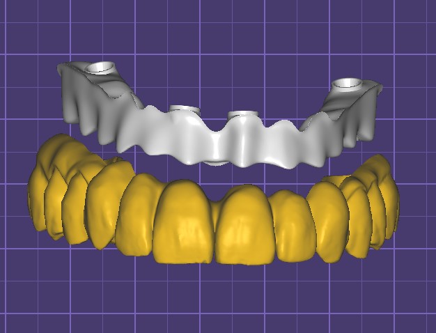 The provisionals were first designed to be milled in PMMA. Later, the definitive prosthesis was replicated from the provisional with minor adjustments, resulting in a zirconia structure supported by a titanium bar.